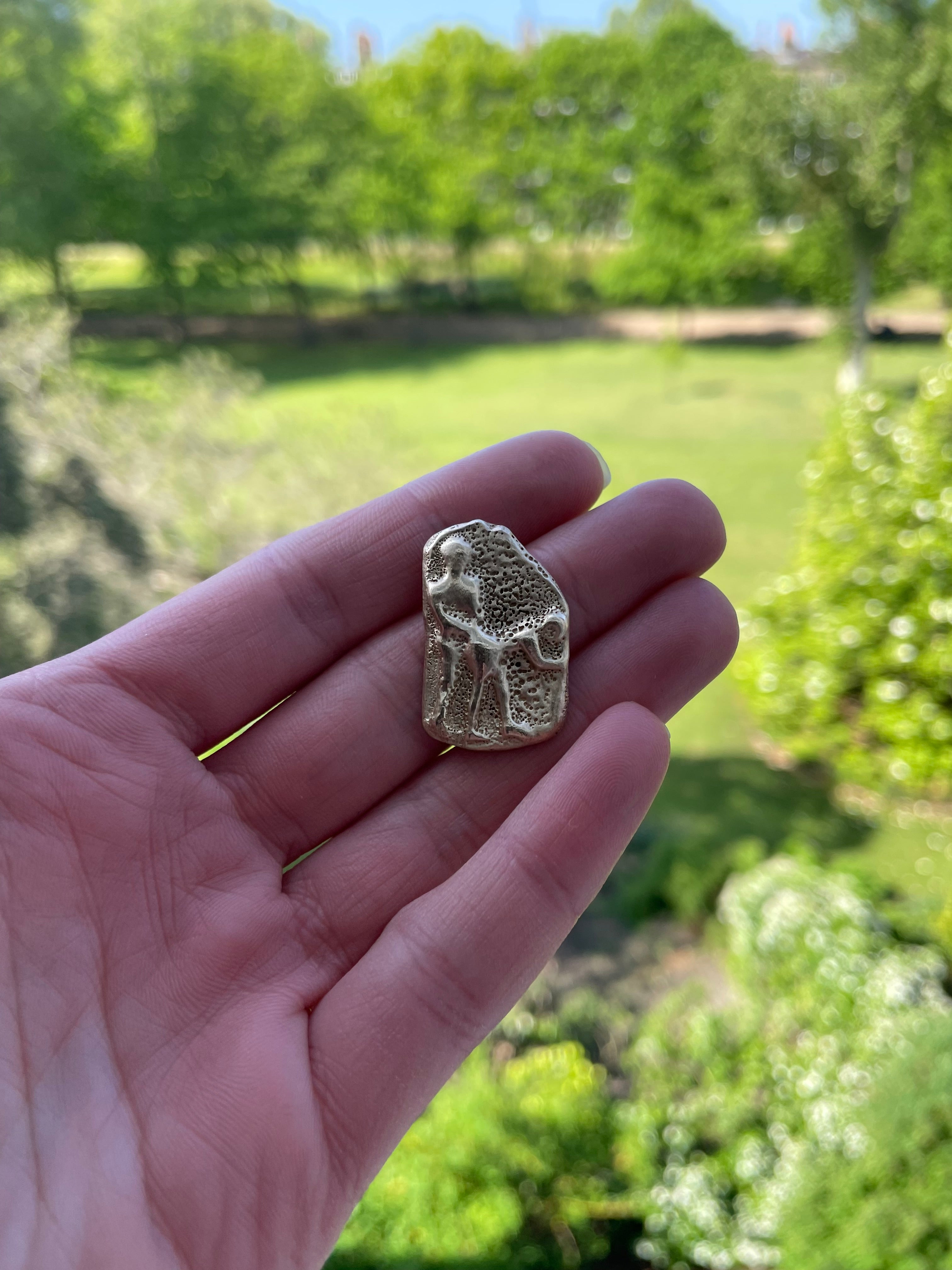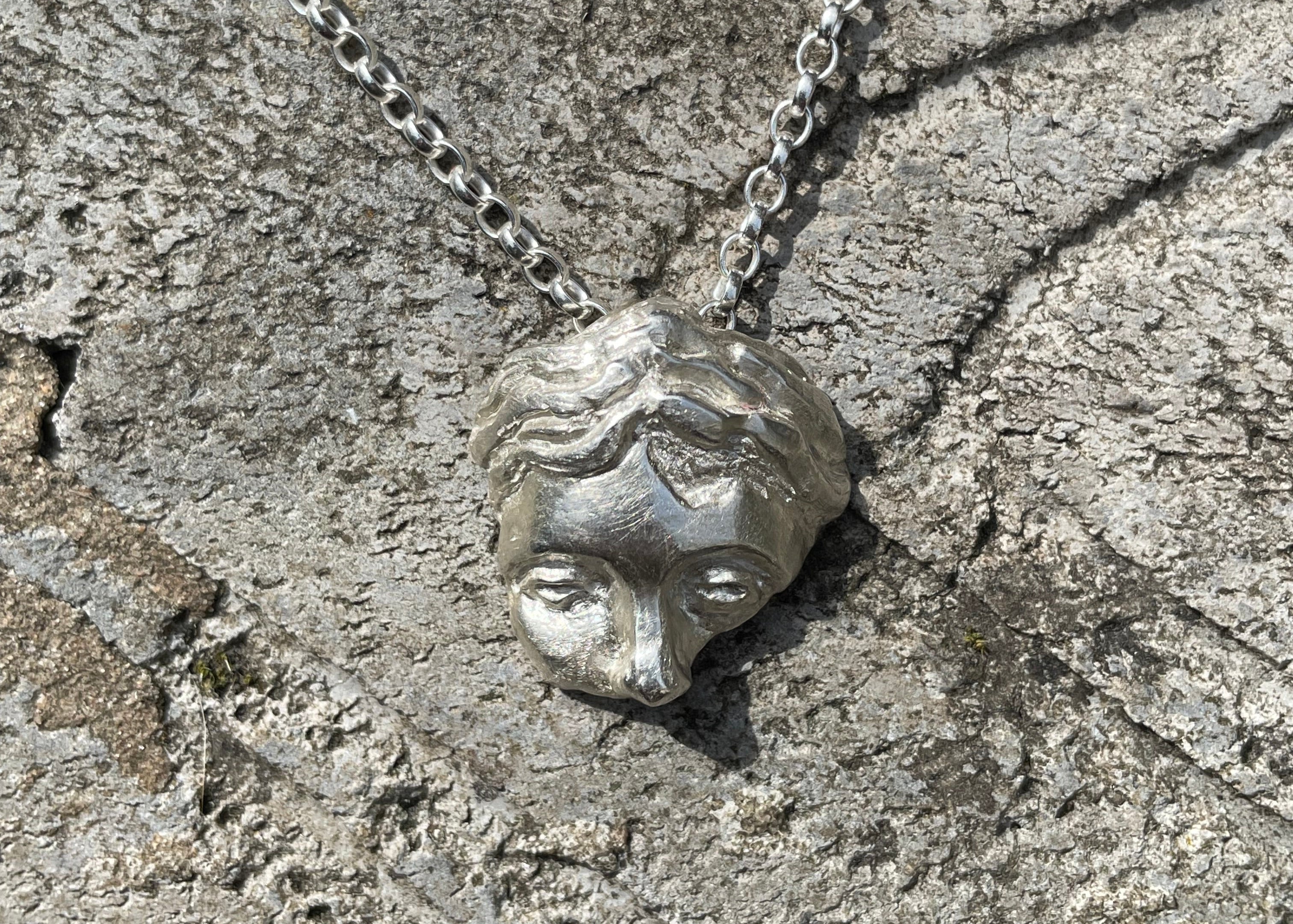 Previous training at The Royal Drawing School now informs the making of wearable, sculptural works that reimagine Roman rings, and pendants inspired by fragments of ancient carvings.